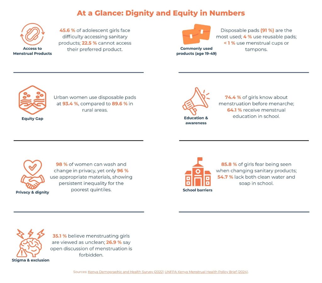 Sources: Kenya Demographic and Health Survey (2022); UNFPA Kenya Menstrual Health Policy Brief (2024); UN Women Data Portal (2023); UNICEF/WHO JMP Menstrual Health Data (2023); Kenya Ministry of Health MHM Policy 2019-2030; Office of the Auditor-General, 2022