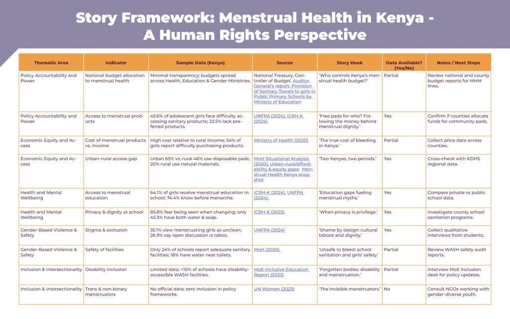 This framework supports journalists in uncovering underreported stories that frame menstrual health as a human rights and equity issue, not merely a hygiene concern. It brings together evidence on how policy, accountability, and menstrual health equity intersect in Kenya, offering guidance on reporting beyond pads and WASH, to explore menstruation as a matter of rights, governance, economics, and social justice.